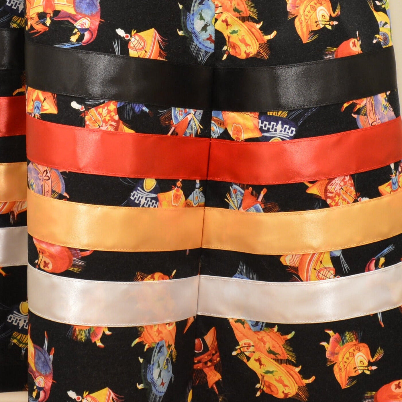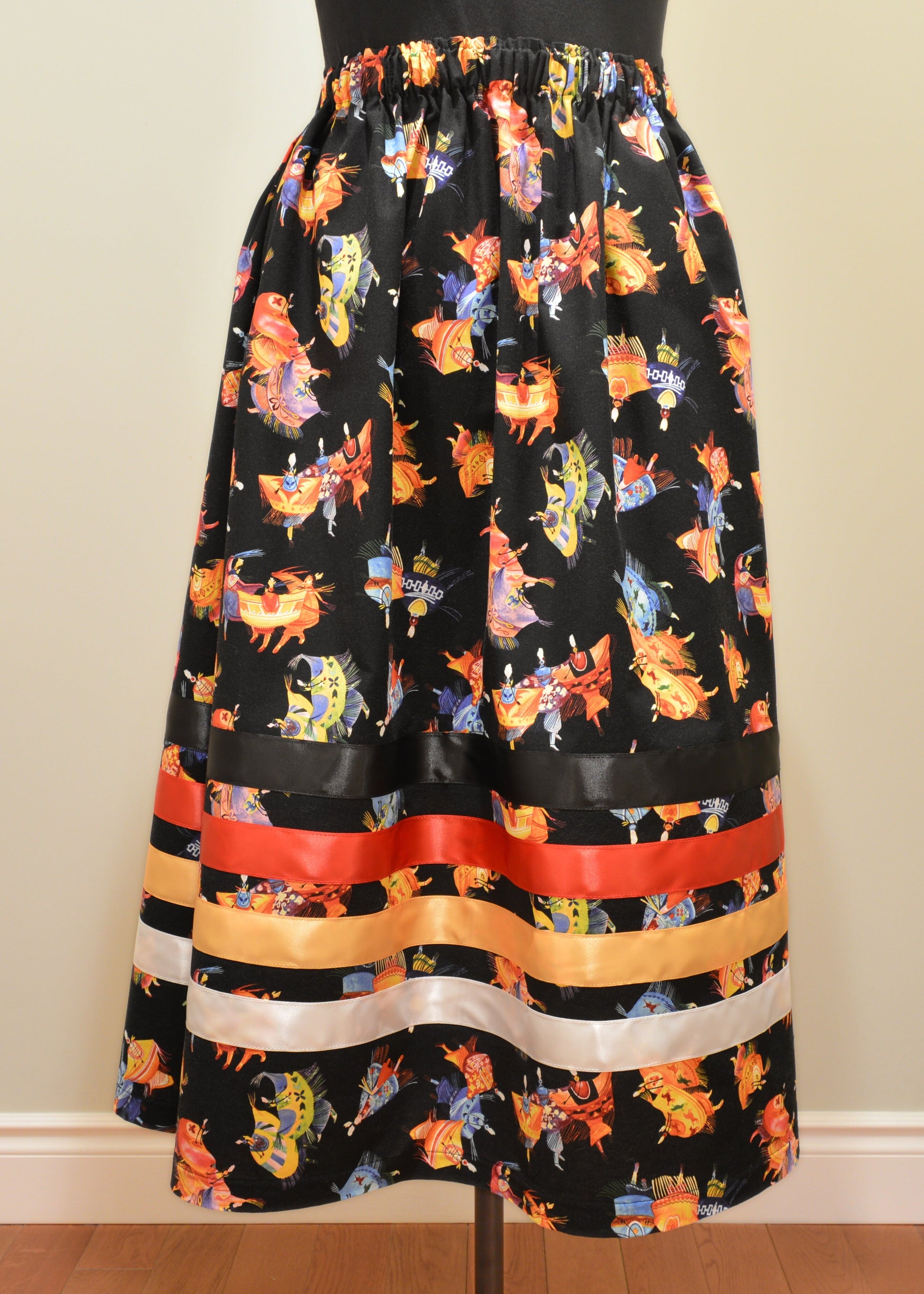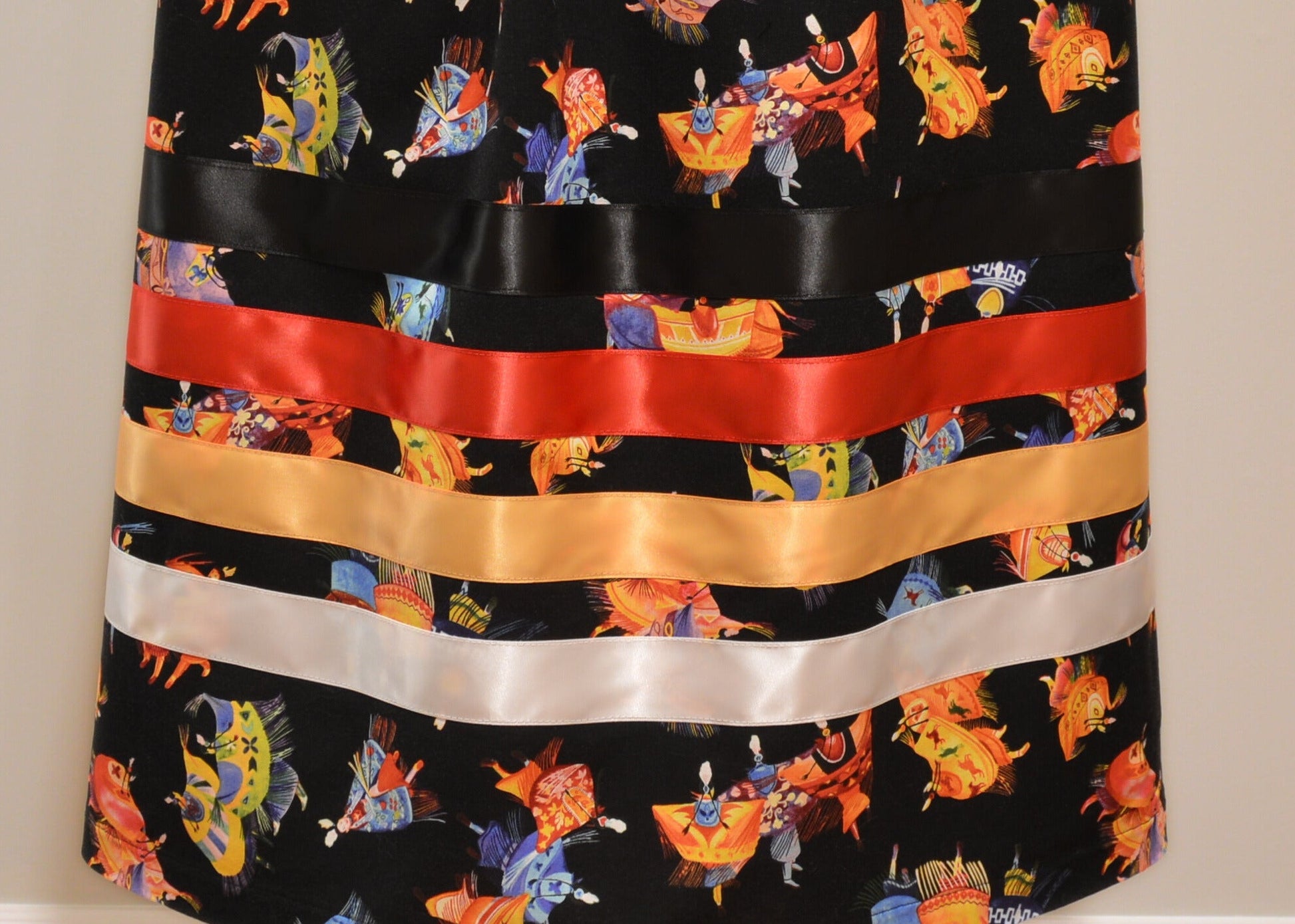 Jupe trapèze à ruban, faite à la main, ornée d'un motif châle noir inspiré des danseuses.