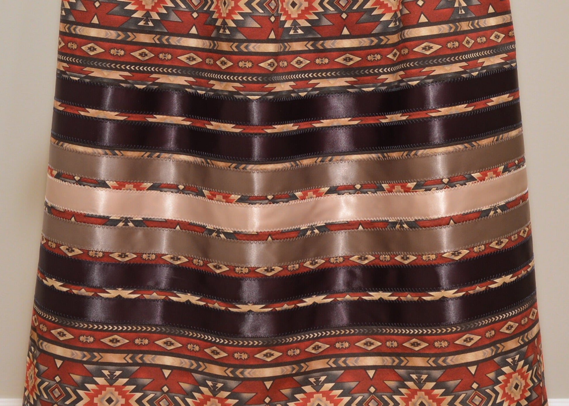 Jupe trapèze à ruban, faite à la main, ornée d'un motif géométrique bordeaux.